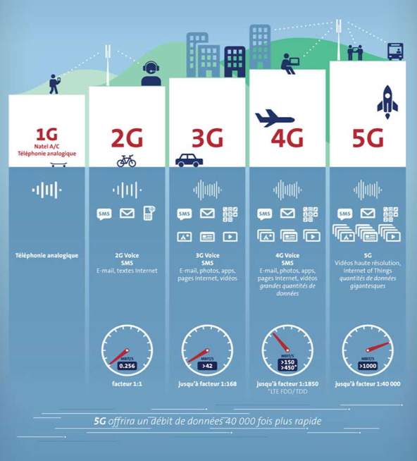 La téléphonie 5G va permettre des pointes de jusqu'à 10 gigabits par seconde (Gbit/s). Par comparaison, la vitesse maximale en mode statique pour un ménage privé s'élève actuellement à 1 Gbit/s. La future technologie mobile serait donc 10 fois plus rapide que le réseau Internet le plus performant existant en Suisse.