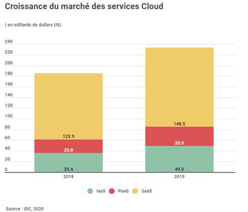 Les services de cloud publics comprennent les segments tels que l'infrastructure en tant que service (IaaS), la plateforme en tant que service (PaaS) et les logiciels en tant que service (SaaS). Selon IDC, le marché des IaaS et PaaS a connu une croissance deux fois plus rapide que le marché des SaaS. Néanmoins, ce dernier est toujours le plus important.