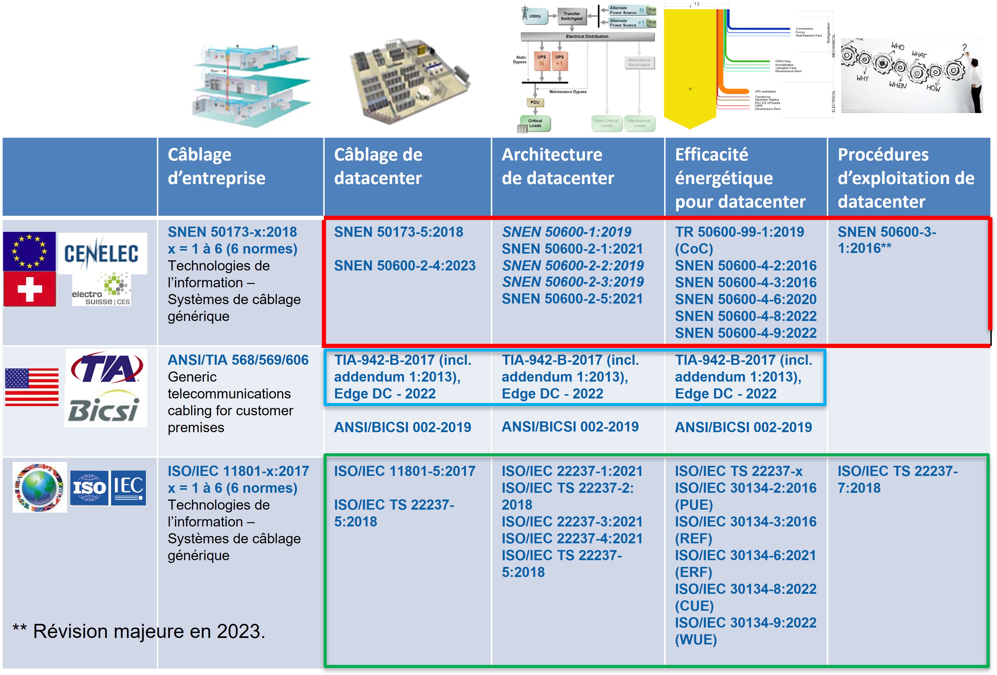 La figure ci-dessous en illustre les principales composantes actuelles, sans être exhaustive. Elle montre que l'Europe, avec la famille de normes 50600, bien qu'arrivée tardivement sur le Marché, va avoir un impact considérable dans les prochaines années. En effet, l'organisation internationale de normalisation ISO reprend progressivement cette série de normes en tant que normes ISO 22237-1 à ISO 22237-7.